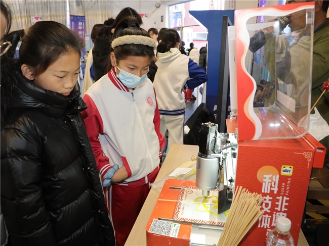 在“非遗新造·舌尖上的科学”文化工坊区,糖葫芦、驴打滚、手工糖画的摊位前围满了学生。与往日不同的是,传统的非遗项目旁,常常搭配着高科技的“邻居”。