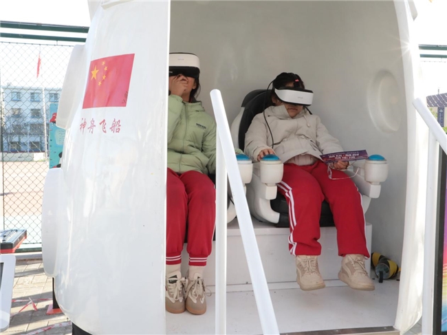 两台人形机器人随着学生自选的音乐节奏翩翩起舞,动作由AI算法生成;戴上VR头盔,学生瞬间“化身”航天员,沉浸式体验神舟飞船发射的全流程;在“AI太极”体验区,摄像头捕捉着学生的动作,系统实时给出评分与纠正建议……